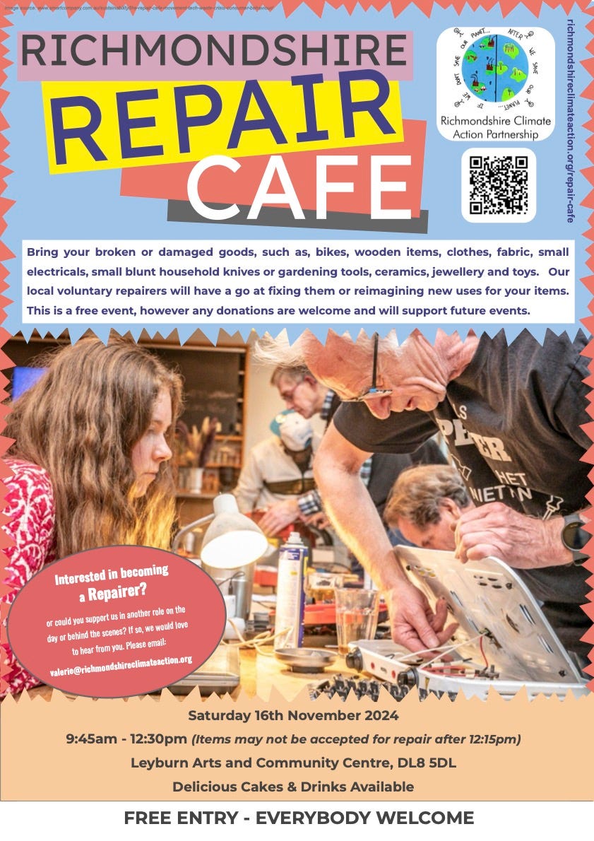 We’ll be at the Richmondshire Climate Action Partnership Repair Cafe and Eco Fair on Sunday 19th January from 9.45am to 12.30pm in Richmond School 6th Form Hall. We’ll be one of those providing information on ways to lower your carbon footprint, recycling and environmental issues - please do drop in and say ‘Hi!’.